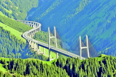 2011年9月30日,果子溝大橋正式通車運營。這是國內首座雙塔雙索面鋼桁梁斜拉橋,被譽為“新疆第一橋”。