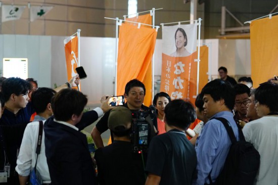 7月13日,在日本千葉縣,參政黨黨首神谷宗幣(中)在街頭演說活動后接受媒體採訪。新華社記者賈浩成攝