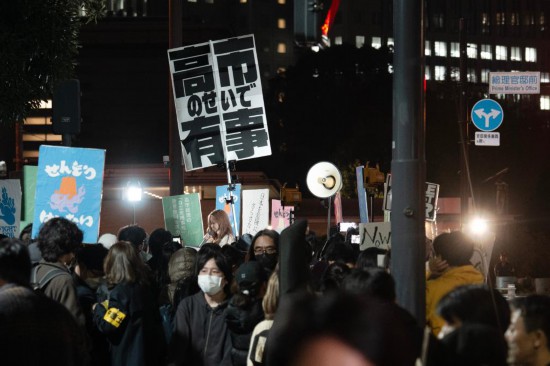 數百名日本民眾21日晚在位於東京的首相官邸前舉行集會,抗議日本首相高市早苗近日在國會發表的涉台錯誤言論,要求其撤回相關表態並作出解釋和道歉。新華社記者賈浩成攝