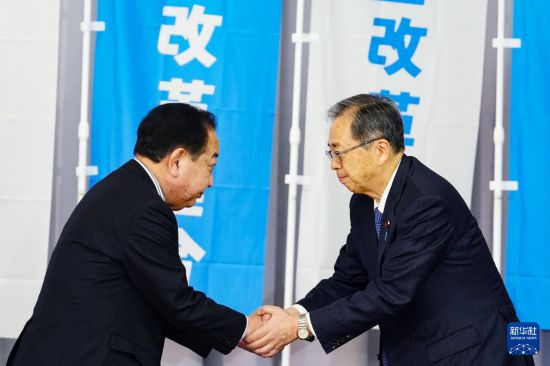 1月22日,在日本東京,“中道改革聯合”共同代表野田佳彥(左)與齊藤鐵夫在建黨大會上握手。新華社記者 賈浩成 攝