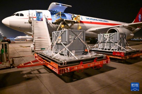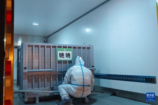 1月28日凌晨,大熊貓“曉曉”“蕾蕾”飛抵成都天府國際機場。新華社發(中國大熊貓保護研究中心供圖)