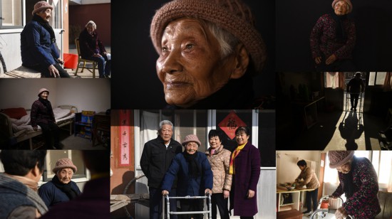 中上:巫吉英肖像;中下:巫吉英在家门口和大儿子张爱华、二女儿张月珍、小女儿张素琴(右)合影;左上:巫吉英在家门口与邻居聊天、晒太阳;左中:巫吉英在自己卧室内;左下:巫吉英在家门口和女儿聊天;右上:巫吉英在指认被侵华日军刺伤的部位;右中:巫吉英腿脚不好,只能靠助行器行走;右下:巫吉英准备走到饭桌前吃午饭(拼版照片,12月5日摄)。