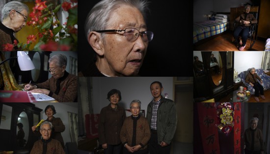 中上:经智珍肖像;中下:经智珍在家中和女儿何敏霞(左)、儿子何敏崑合影;左上:经智珍在阳台上侍弄花草;左中:经智珍在家中练字;左下:女儿何敏霞在给经智珍梳头;右上:经智珍在自己卧室内;右中:经智珍在家中和儿女聊天;右下:经智珍在自家门口(拼版照片,11月7日摄)。